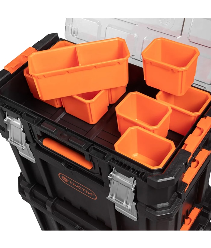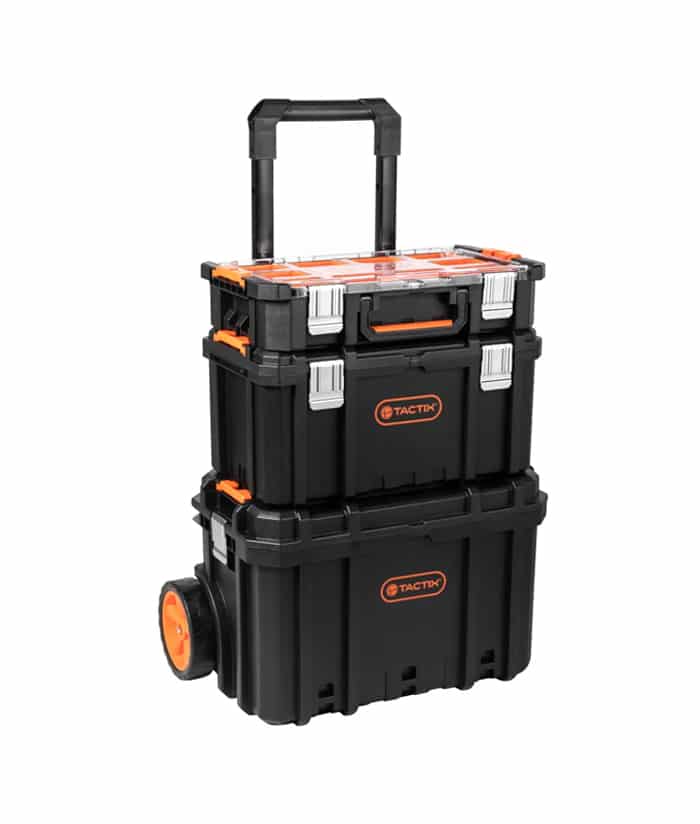El módulo inferior es un baúl de gran volumen con ruedas de 7 pulgadas y asa telescópica, ideal para herramientas eléctricas y equipos pesados. El módulo intermedio ofrece un espacio profundo para herramientas manuales, y el superior es una clásica caja de herramientas con bandeja extraíble y organizadores en la tapa para piezas pequeñas. Sus cierres metálicos y su construcción resistente garantizan la máxima seguridad para tu equipo.