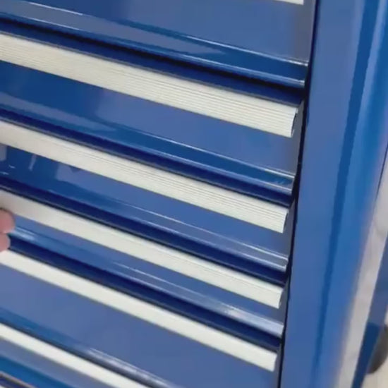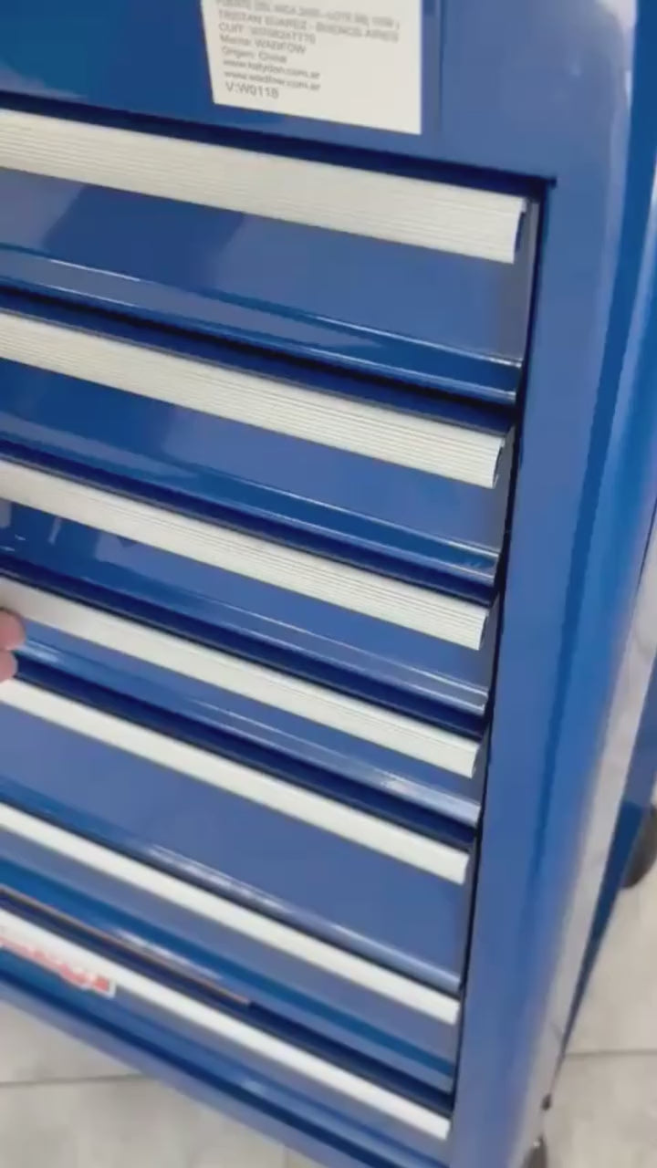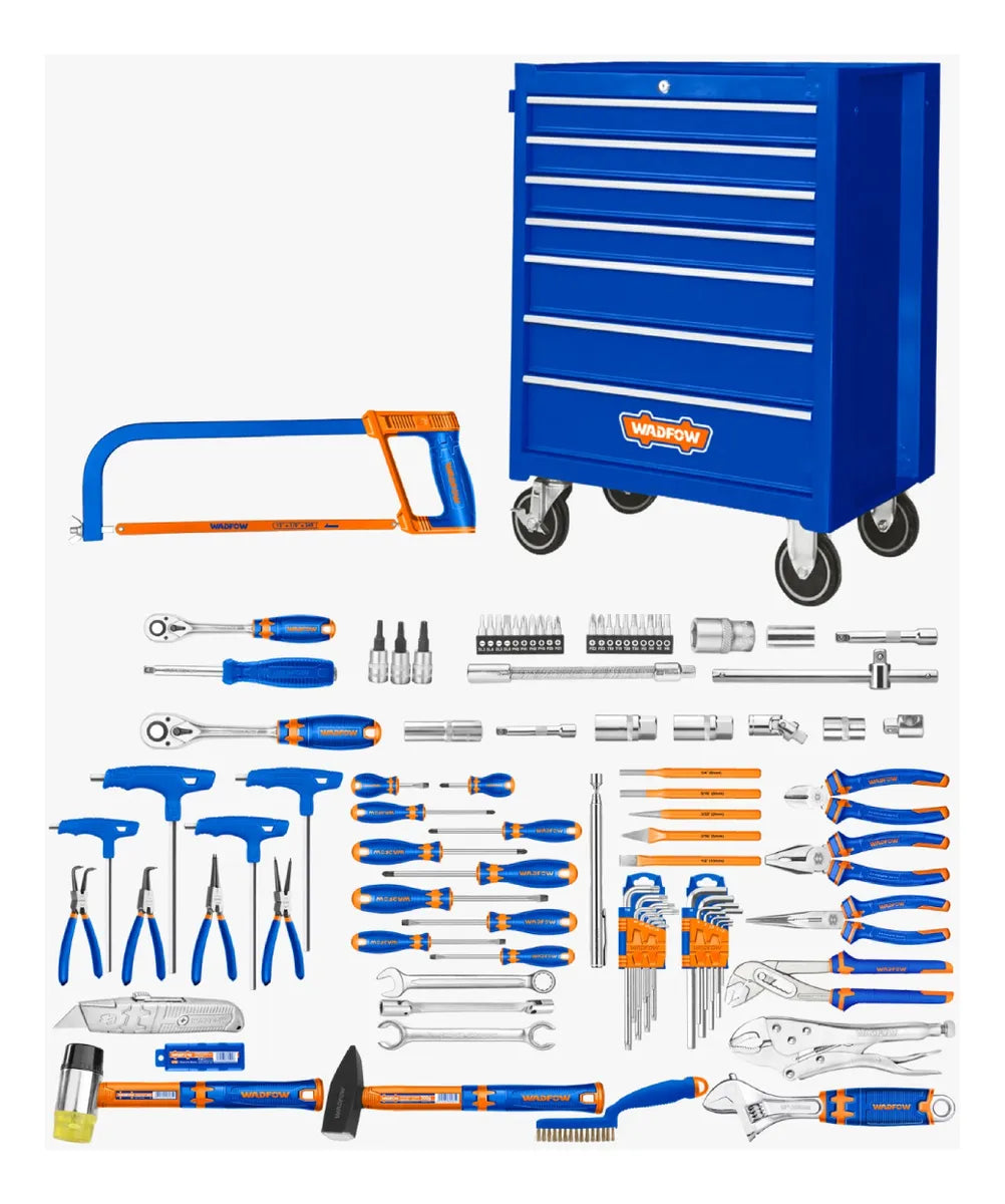 Gabinete metálico con 7 cajones y 209 herramientas para taller. Dimensiones aprox.: 688×458×735 mm. Incluye vasos, llaves, destornilladores, alicates, martillo y más. Ideal para mecánica y mantenimiento.