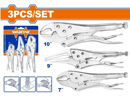 Aplica una fuerza de sujeción inmensa y trabaja con las manos libres con el Set de 3 Alicates de Bloqueo (Pinzas de Presión) de WADFOW. Este juego es un aliado indispensable en cualquier taller de soldadura, mecánica o carpintería, funcionando como una "tercera mano" de agarre poderoso.